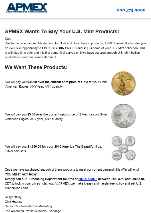 Pour parer à l’incroyable demande de produits en argent et or, Apmex, qui est l’un des plus gros vendeurs américains de métaux précieux, vous propose désormais de vous racheter vos pièces d’american eagles en argent et or. Les pièces en argent sont rachetées à 3$ de plus que le prix officiel (spot) ou $38 de plus pour les pièces en or et ce, quelque soit la quantité ou l’année de production. Qui à dit bulle sur l’argent métal ?