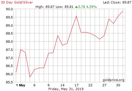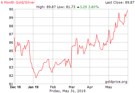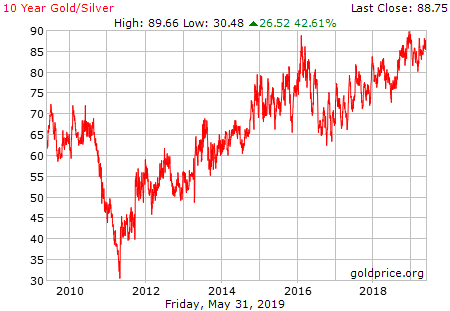 Le ratio or/argent est la division du prix d’une once/gramme/kilo d’or sur celui de l’argent. Voici ci-dessous l’historique de ce ratio sur 1 mois, 6 mois, 1 an et 10 ans. Vous pouvez aussi obtenir un ratio de l’argent métal avec n’importe quel matière première en utilisant l’application Gold Ratio pour Iphone.